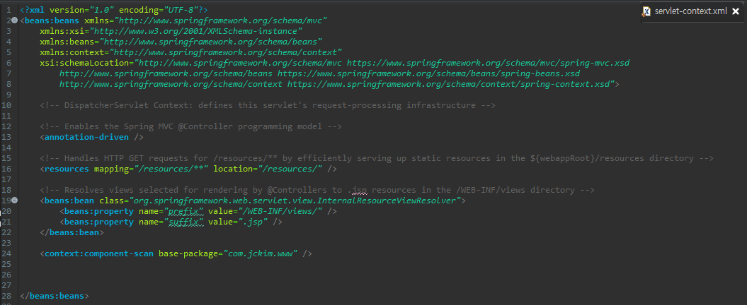 - ViewResolver bean : 다양한 ViewResolver가 존재하지만 기본 설정에서 사용되는 InternalResourceViewResolver은 @Controller에 요청을 받고 비지니스 로직 처리 후 반환 값을 기준으로 자원 경로의 패턴을 설정한다. prefix에 자원의 경로를 설정하고 suffix에 확장자를 설정한 것이다.